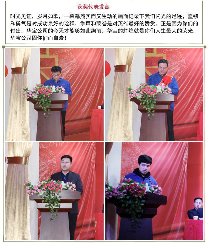 2019年1月28日華寶集團(tuán)在制品公司隆重召開了“2018總結(jié)表彰暨2019迎新晚會(huì)”。集團(tuán)公司董事長總經(jīng)理陳增國、集團(tuán)公司副總經(jīng)理馬國良、集團(tuán)公司副總經(jīng)理制品公司總經(jīng)理趙青欣,集團(tuán)黨委書記機(jī)械公司董事長白云亮、集團(tuán)黨委副書記機(jī)械公司總經(jīng)理馬書辰、醫(yī)用公司董事長楊棉、總經(jīng)理劉紅坡、薄膜公司總經(jīng)理劉軍旗等領(lǐng)導(dǎo)及勞動(dòng)模范、先進(jìn)個(gè)人、先進(jìn)集體代表、全體員工1400余人參加了大會(huì)。