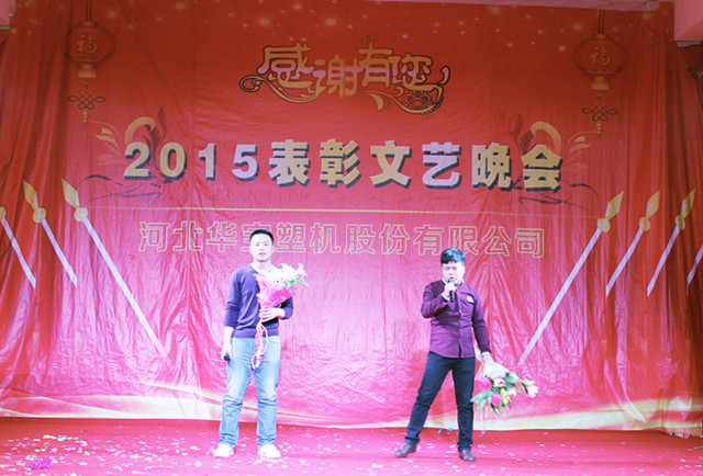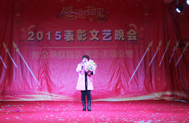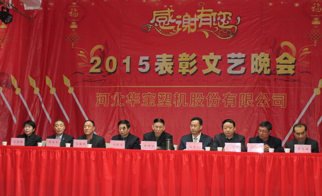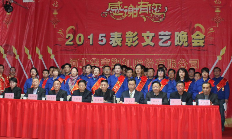 2016年1月29日華寶集團(tuán)在制品公司隆重召開(kāi)二〇一五年度表彰文藝晚會(huì),集團(tuán)公司總經(jīng)理陳增國(guó)、副總經(jīng)理馬國(guó)良、劉敏奇、趙青欣、劉軍旗、機(jī)械公司副經(jīng)理柴連水、制品公司副經(jīng)理安素敏、醫(yī)療用品公司副經(jīng)理李廣、薄膜公司副經(jīng)理張軍強(qiáng)及勞動(dòng)模范、先進(jìn)個(gè)人、先進(jìn)集體代表、全體員工1300余人參加了大會(huì)。